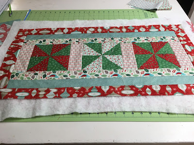 I made three pinwheels and put them together with 2-1/2" strips of another fabric. You can do this center anyway you please according to the piece of batting you have and any blocks you have on hand or decide to make.