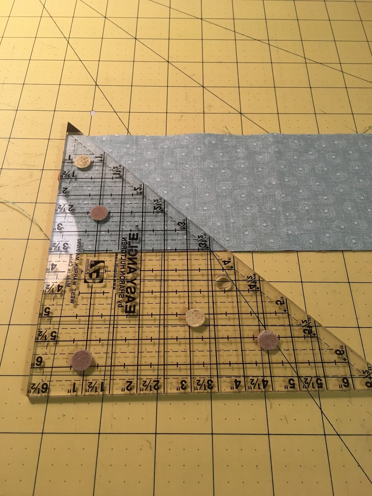 I love that little Christmas tree print on the left, but there was only about 6" of it. I decided it could become pinwheel blocks for the center. I made 6-1/2" unfinished blocks, starting with 3-1/2" strips, cutting the HST's with my Easy Angle ruler, my favorite method.